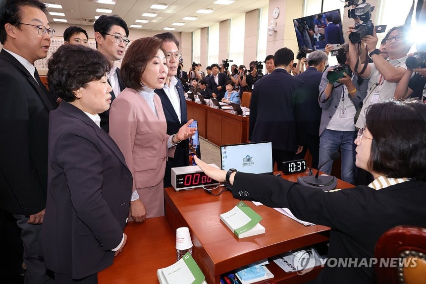 국민의힘은 지난 회의에서 민주당 주도로 부결된 나경원 의원의 간사 선임 안건을 재차 요구하며 회의 진행에 항의했다. 나 의원은 "이곳은 추미애의 법사위가 아니다"라며 거세게 항의했고, 추 위원장은 "일사부재리 원칙에 따라 발언권이 없다"고 일축했다. 양측의 고성과 언쟁이 이어지면서 회의는 한 시간 가까이 중단되는 등 극심한 혼란을 겪었다.