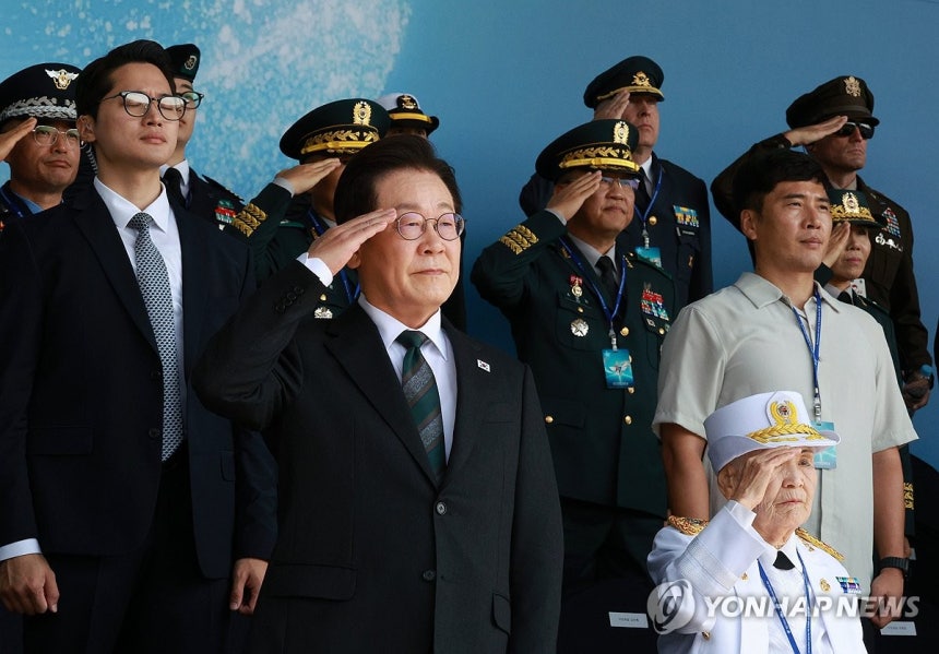 2025년 10월 1일, 충남 계룡대 대연병장에서 이재명 대통령이 열병차량에 탑승해 거수경례하고 있다.